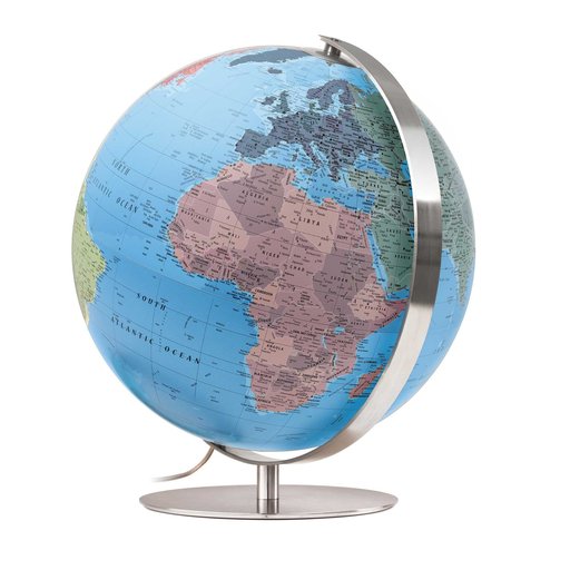Jordgloben är dessutom utrustad med en inbyggd, energisnål LED-ljuskälla på 4 watt. Tänd globen när mörkret faller för att förvandla den till en vacker och rogivande ljuskälla som framhäver ländernas gränser och detaljer på ett nytt sätt. Samtliga ortsnamn och geografiska benämningar är på engelska, vilket ger produkten en internationell prägel som passar perfekt i både hemmiljö och i mötesrummet.