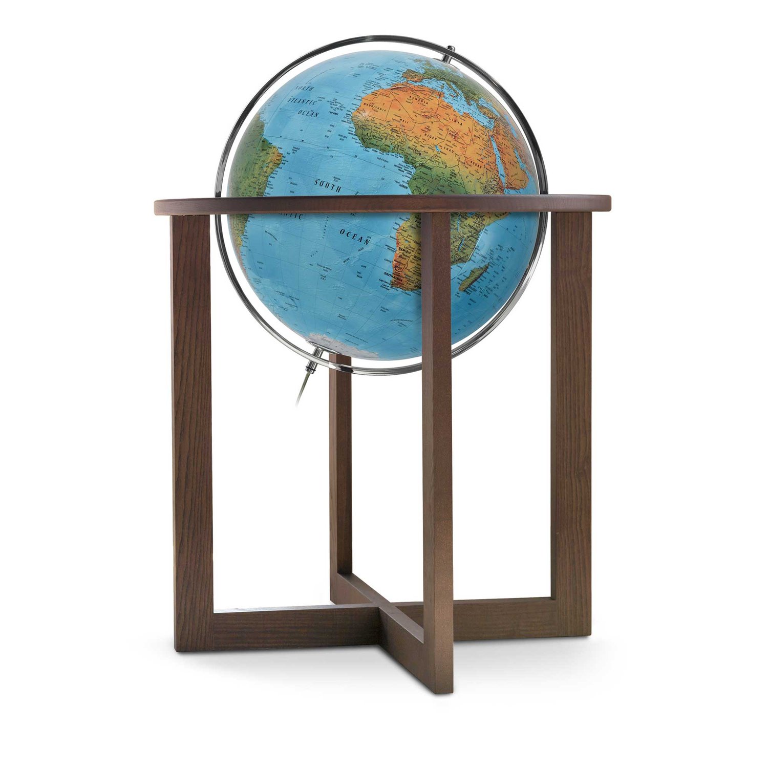 Kartografin är modern och mycket exakt, uppbyggd med hjälp av verklig satellitdata för att ge en realistisk fysisk representation av vår planet. All text och alla geografiska namn är tydligt utmärkta på engelska. När kvällen smyger sig på får globen ännu en funktion tack vare den inbyggda LED-belysningen. Lampan ger ett behagligt och stämningsfullt ljus som framhäver jordens topografi inifrån, vilket gör detta till ett fascinerande och vackert inslag i hemmet under dygnets alla timmar.