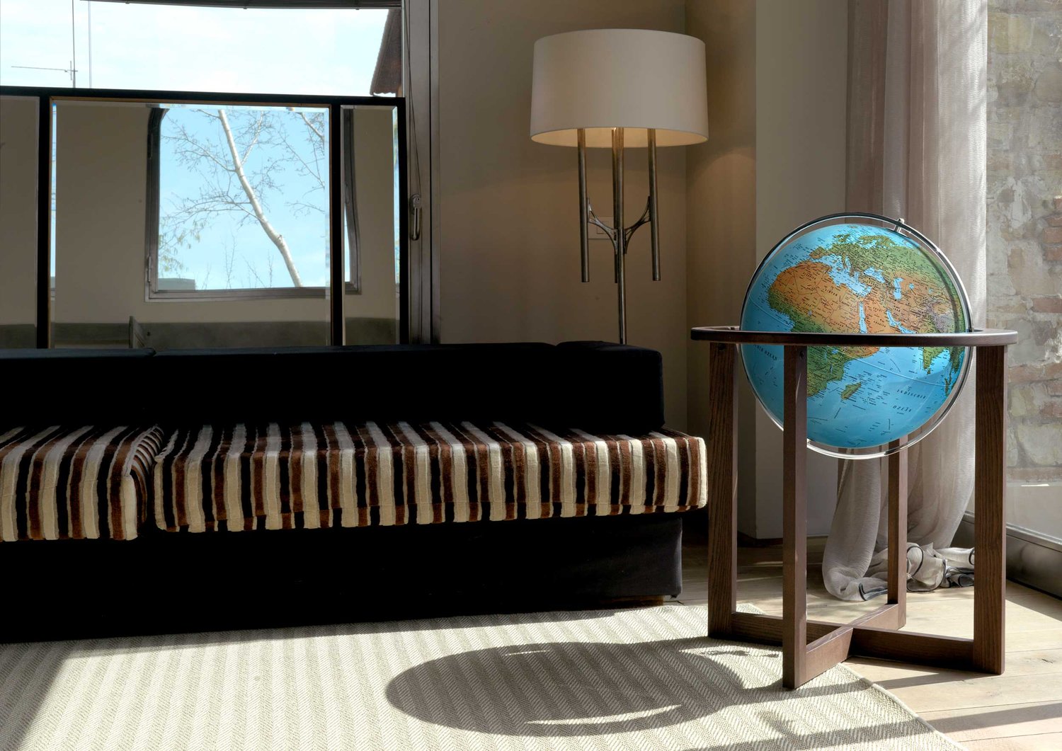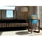 Designen förenar på ett mästerligt sätt modern minimalism med gedigen tradition. Det kryssformade stativet är tillverkat av vackert, mörkt askträ som ger ett varmt och exklusivt intryck. Träet kontrasterar elegant mot den omslutande, vridbara meridianen i kromad metall, vilket gör att globen enkelt kan snurras och betraktas från alla vinklar. Ytskiktet består av en papperskarta som har applicerats för hand genom traditionell laminering, ett hantverk som säkerställer högsta kvalitet och finish.